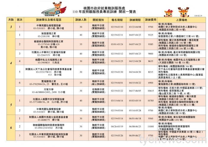 桃園市政府以在地健康老化理念,並持續推動照顧服務產業業務及建構「一區一日照」及且優質的長照服務,桃園市就業職訓服務處「桃園『有頭鹿』職能訓練場」為培訓照顧服務產業之專業人力,於110年度開辦照顧服務員專班訓練計25班次,提供至少820個訓練機會,歡迎想加入照顧服務產業的朋友踴躍參加!