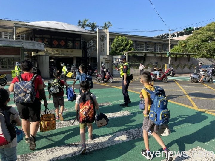 各級學校今天開學,八德分局為配合轄區學校編排「護童勤務」,維護孩童上學秩序,各派出所同時編排勤務提升學區見警率,加強學區交通及校園週邊安全維護;另有鑑於目前仍屬疫情期間,也呼籲學童們戴口罩勤洗手,配合學校相關防疫措施,保持健康的身體,快樂上學平安回家。