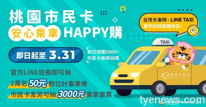 資科局表示,桃園市政府為了感謝市民朋友堅守防疫陣線,擴大成立市民卡官方Line帳號,並於春節期間率先發放數位紅包。日前再推出「安心乘車HAPPY購」活動,與台灣大車隊及LINE TAXI合作,鼓勵民眾登入市民卡LINE官方帳號,即可參加超過百萬元的數位計程車券抽獎,要讓民眾透過安全又舒適的搭車路程,到桃園各地安心購物。50元乘車券及3,000元包月乘車券套票得獎名單皆已抽出,並將於4月15日進行公告,歡迎市民朋友請前往活動網站查詢。