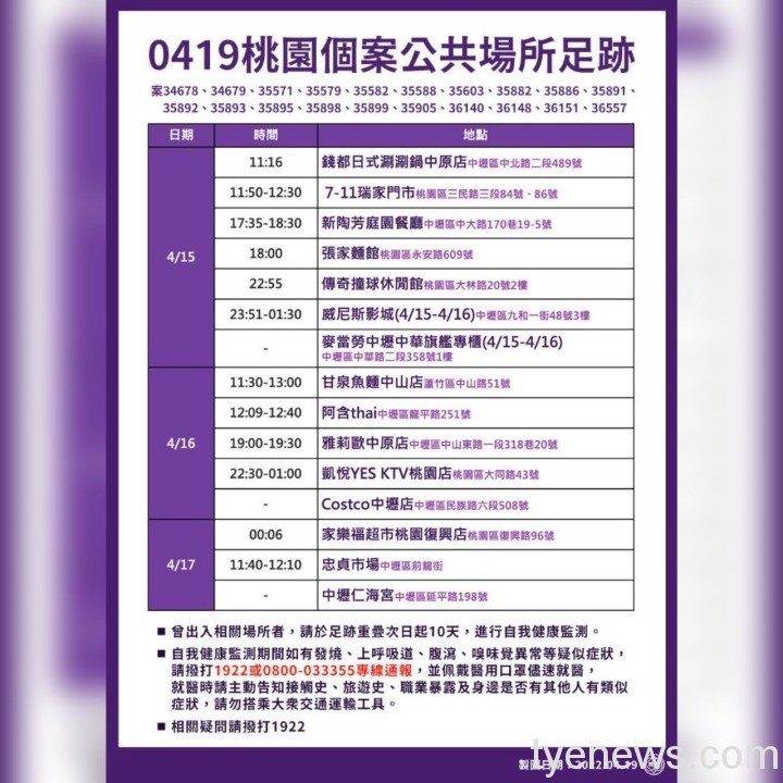 中央流行疫情指揮中心今(19)日宣布,桃園市新增197例本土確診,市府公布最新個案公共場所足跡,請曾出入相關場所者,於足跡重疊次日起10天,進行自我健康監測。