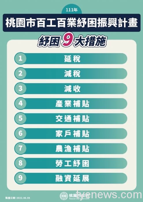 桃園市長鄭文燦昨(8)日表示,在疫情逐漸收斂的同時,市府於今(111)年5至7月間推出第一波「111年桃園市百工百業紓困振興計畫」,含九大紓困、五大振興措施,總計61項方案。紓困振興方案,總經費超過13.5億,包括延稅、減稅、減收、產業補貼、交通補貼、家戶補貼、農漁補貼、勞工紓困及融資延展等37項方案;振興措施則包括觀光休閒、商圈店家、市集振興、產業振興及農漁振興等24項方案,其中,7月起將陸續規劃「台灣好行」大溪快線、小烏來線、石門水庫線、東眼山線,結合週邊景點、門票、餐飲、住宿等推出半價優惠套票,以振興觀光經濟。市府各局處單位從即刻開始,將及早投入紓困振興工作,讓受疫情衝擊的業者都能得到支持,後續也將視疫情滾動式檢討。