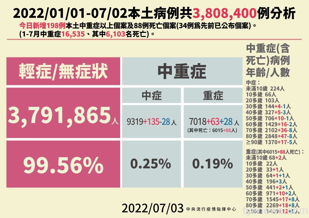 指揮中心指出,今日新增88例本土病例死亡個案,為55例男性、33例女性,年齡介於20多歲至90多歲以上,皆屬重度感染個案、85例具慢性病史、57例未接種3劑 COVID-19疫苗。確診日介於今(2022)年5月4日至6月30日,死亡日期介於6月23日至6月30日。