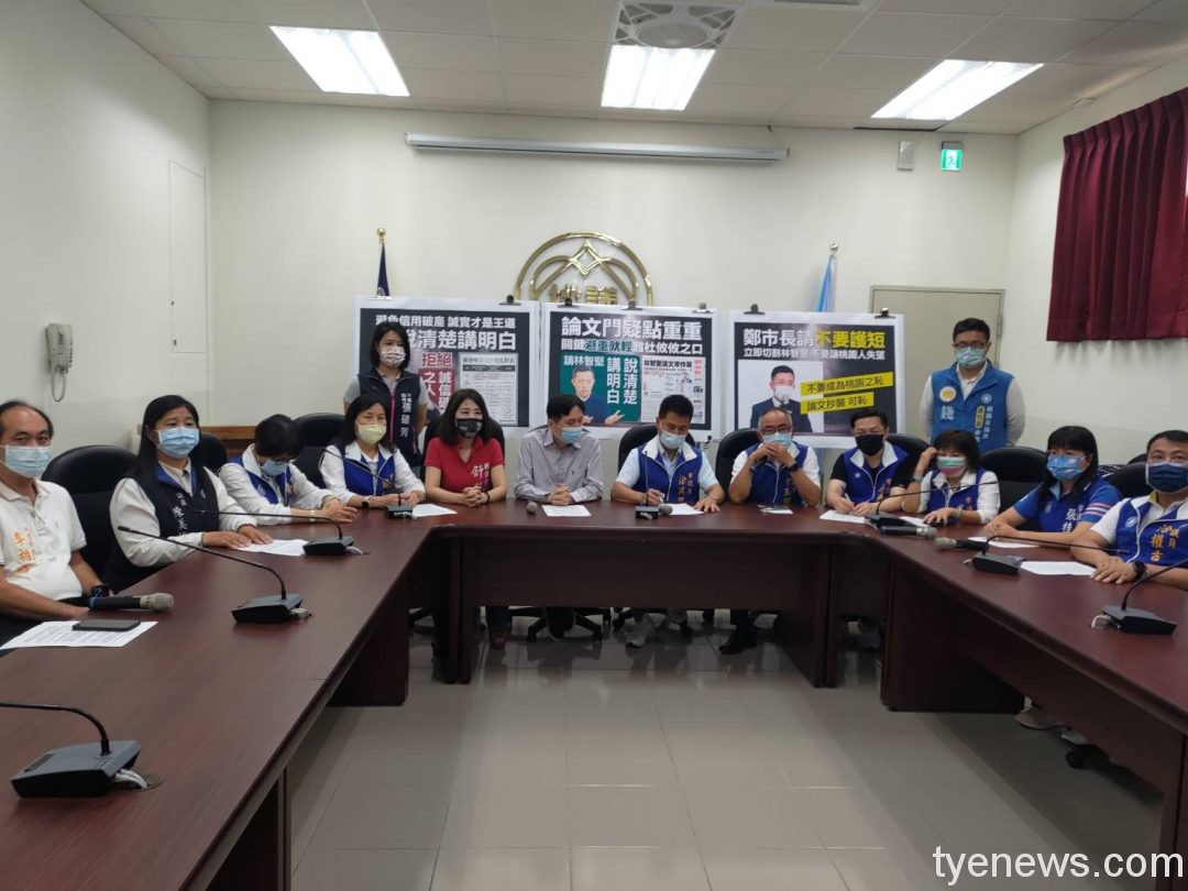 在「沒有誠信的人,沒有資格選市長」、「新竹小白臉桃園快退選」、「不恥剽竊立即退選」等口號聲中,桃園市議會國民黨團14位市議員及2位議員參選人,今(7日)天發出怒吼,要求民進黨撤銷林智堅徵召,涉及雙碩士論文抄襲的新竹市長林智堅應立即道歉認錯並退選。