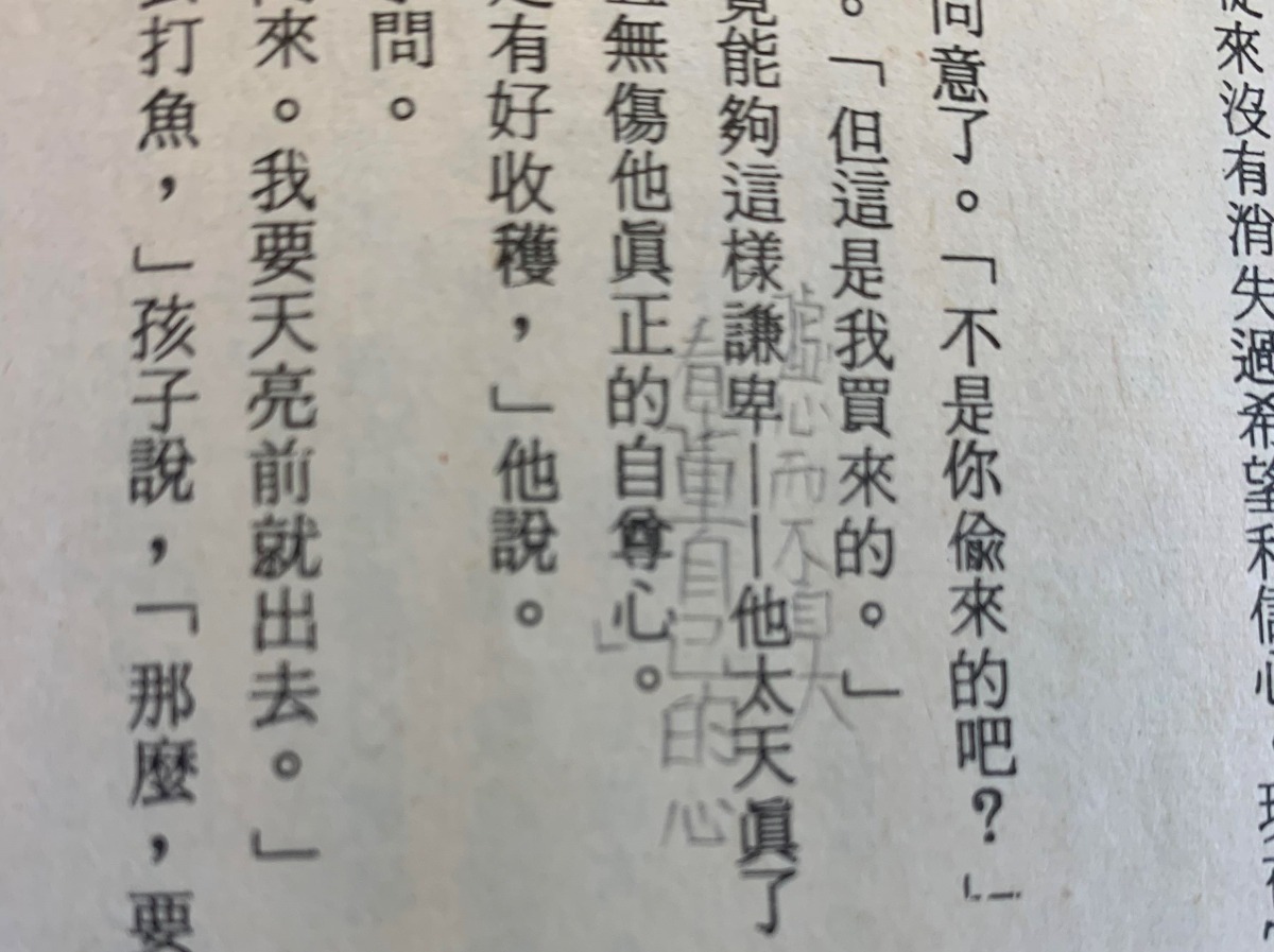 十一歲的我,用拙稚但工整的筆畫,在書頁中的行與行之間寫下字詞的解釋。當時的我無法了解這幾個詞的意思嗎?它們真有那麼困難嗎?以我對自己閱讀軌跡的記憶與自信,應該不是不解它們的意思,之所以煞有其事地翻找字典將解釋一個字一個字抄下來,只是表示我的「決心」-想慎重地、好好地讀這本書,《老人與海》。
