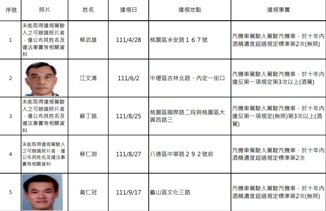 全國酒駕新法已於去(111)年3月31日施行,桃園市交通事件裁決處依據酒駕新法規定,自去年5月9日起公告第一波酒駕累犯者姓名、照片,今(31)日公告第61波名單,此次公布的酒駕累犯有7人。