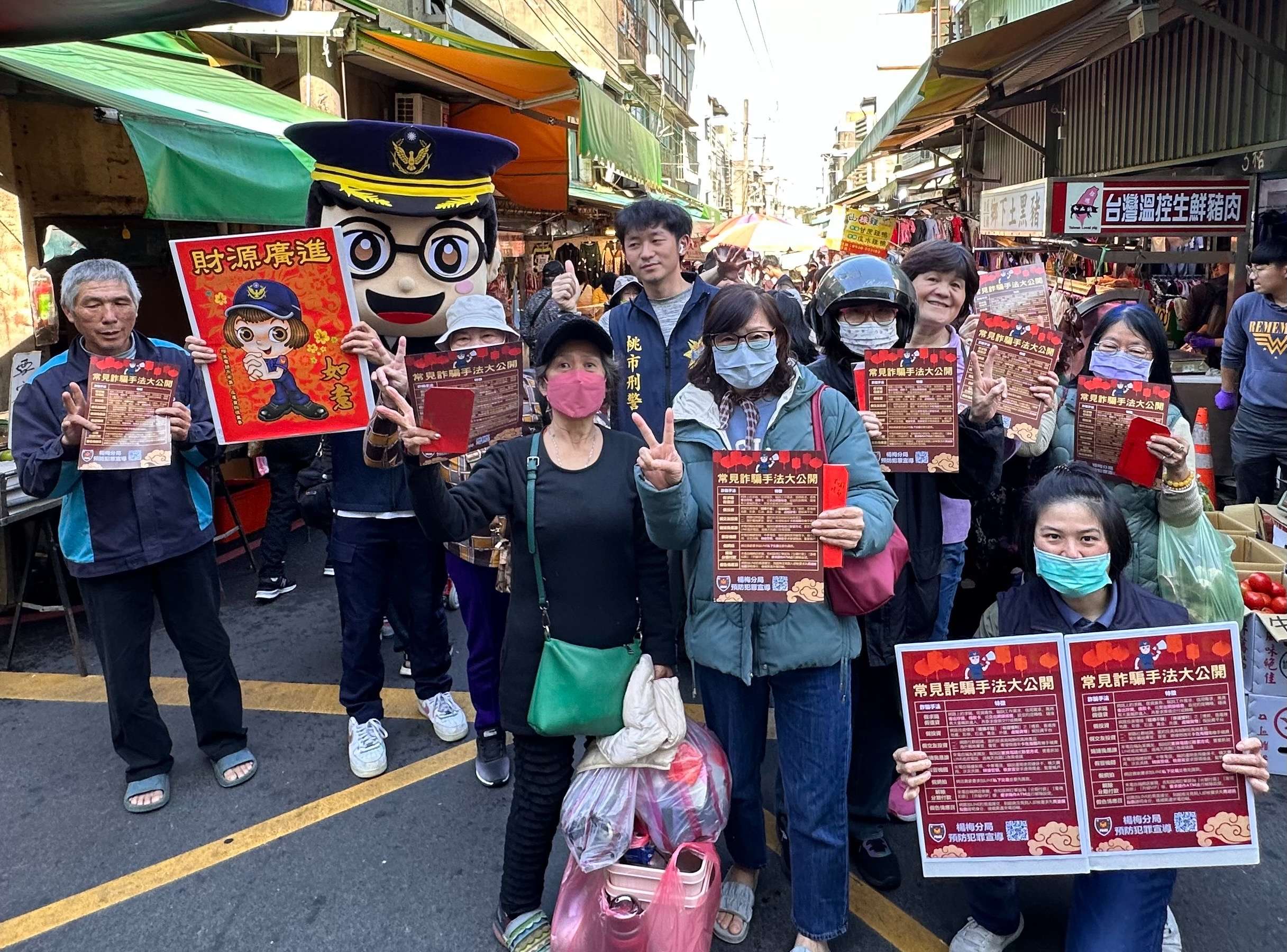 楊梅警分局在農曆春節將近之際,民眾紛紛出門採買年貨,為提醒民眾加強春節期間「防搶、防竊、反詐騙」,前往轄內楊梅菜市場進行預防犯罪宣導,傳遞各項與民眾息息相關的預防犯罪資訊,希望民眾在這闔家歡樂的春節期間,也能顧好自己的荷包。