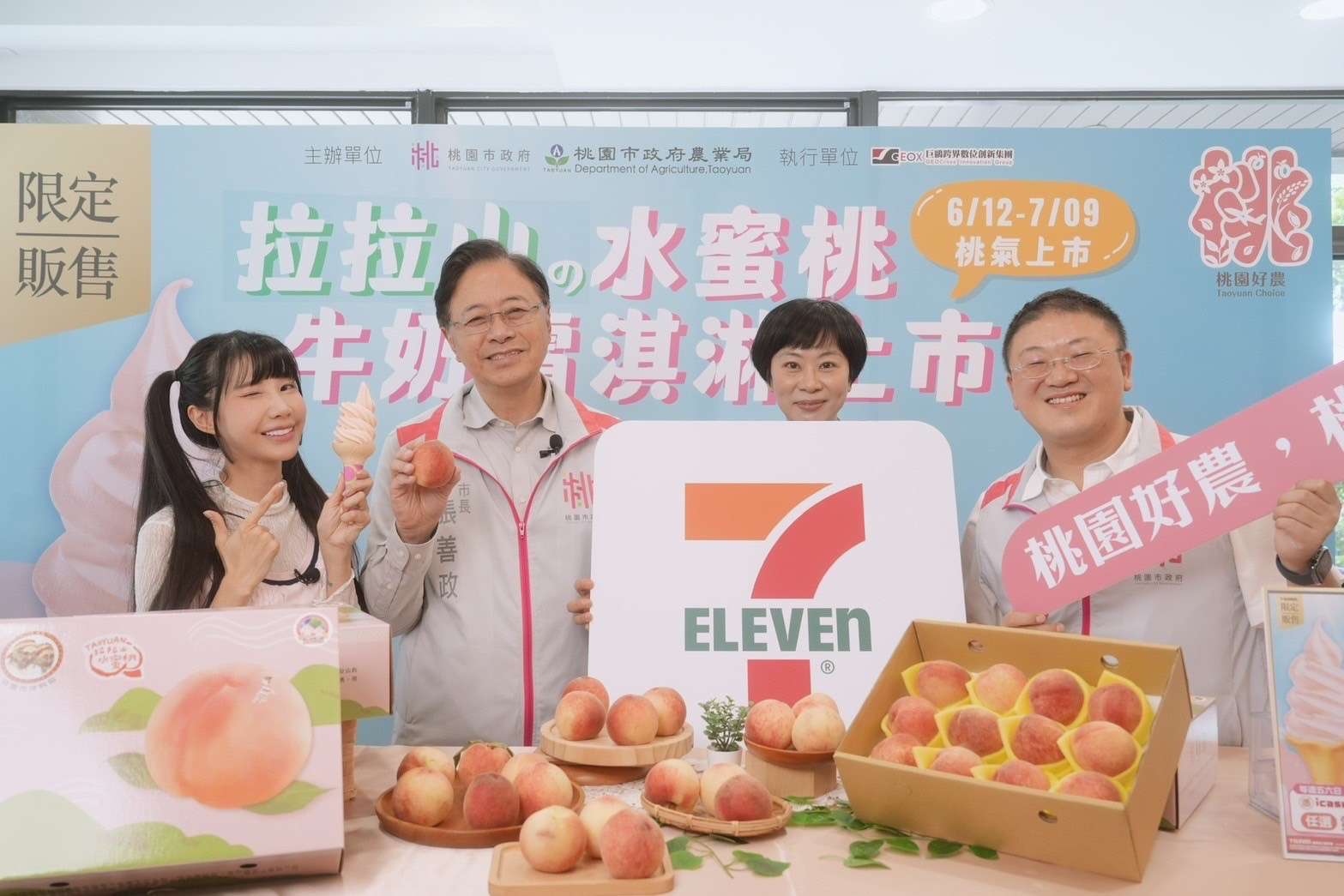 桃園市政府持續推廣「桃園好農計畫」,近期與統一超商7-ELEVEN合作,推出夏季限定甜點「拉拉山水蜜桃霜淇淋」,此款新品定於昨(12)日至7月9日期間銷售。桃園市長張善政今日親上第一線,與「樂天女孩」筠熹透過直播方式,宣傳「拉拉山水蜜桃霜淇淋」,期盼透過跨界組合與通路影響力,持續推廣桃園在地農產品,讓全台各地的消費者都能品嚐到拉拉山水蜜桃的美味。