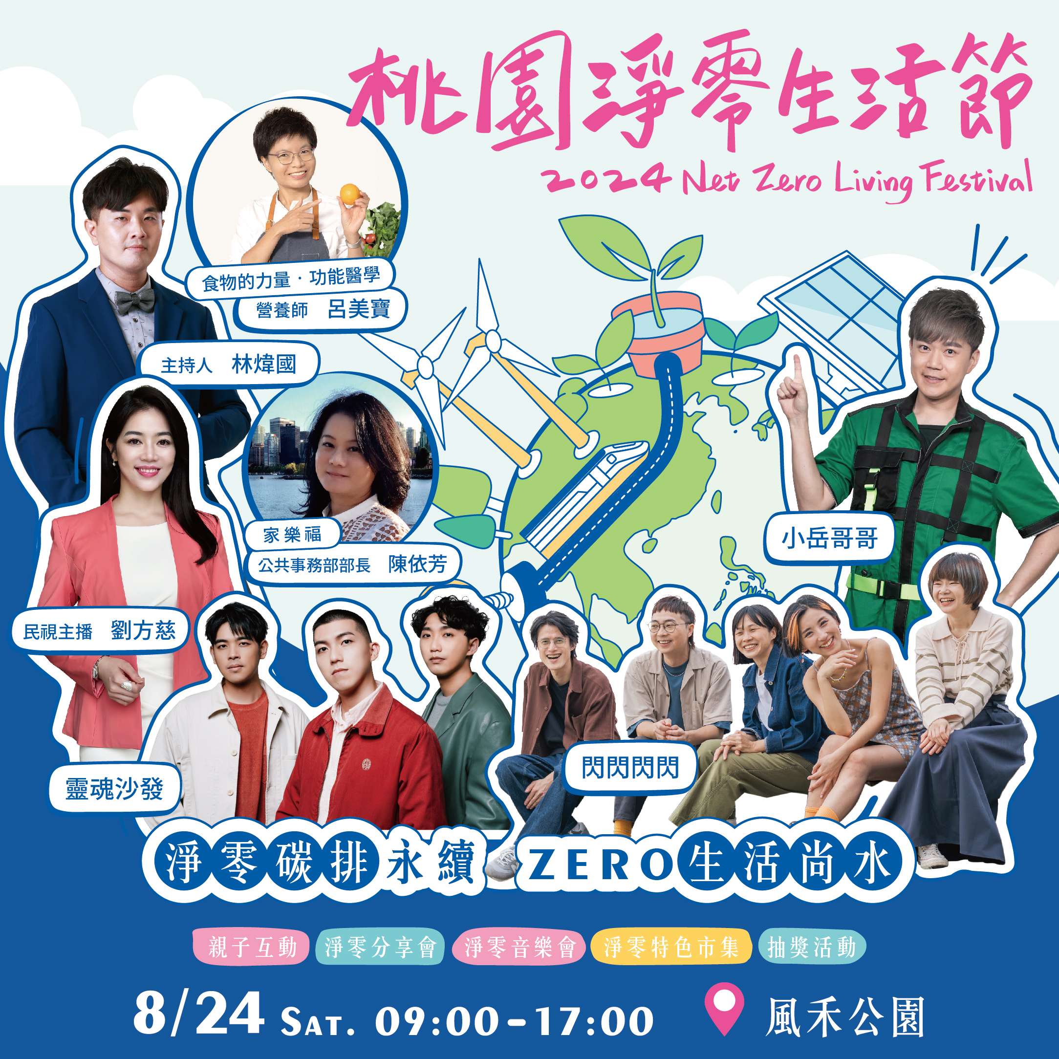 由桃園市環保局主辦的「桃園淨零生活節」將於8月24日上午9點至下午17點在桃園區風禾公園舉辦,有熱鬧的「淨零特色市集」外,還有「靈魂沙發」及「閃閃閃閃」樂團在「淨零音樂會」中演出,也邀請民視人氣主播劉方慈擔任代言人分享淨零生活,以及小岳哥哥陪同大朋友小朋友一同親子互動,同時當天購買淨零市集產品就有機會獲得iPad Air或Dyson空氣清淨機等大獎,在親子同歡享受盛夏精彩的同時也能認識淨零永續新生活。