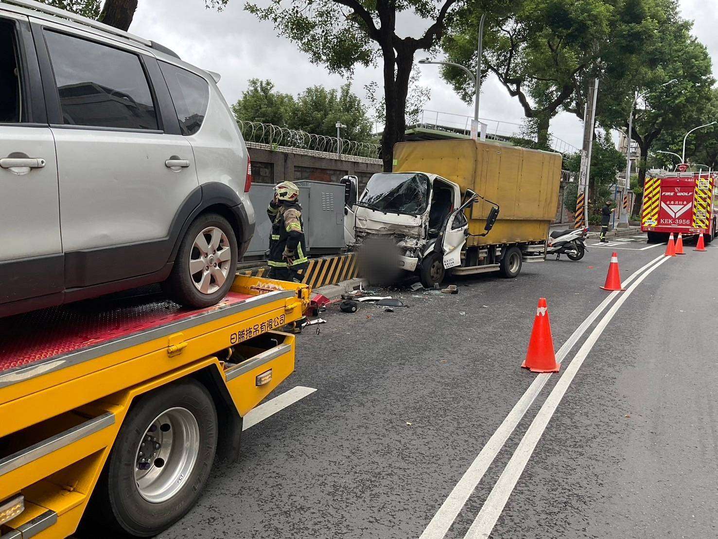 小貨車衝撞台電總開關站電箱及路旁臨停拖吊車。圖:讀者提供