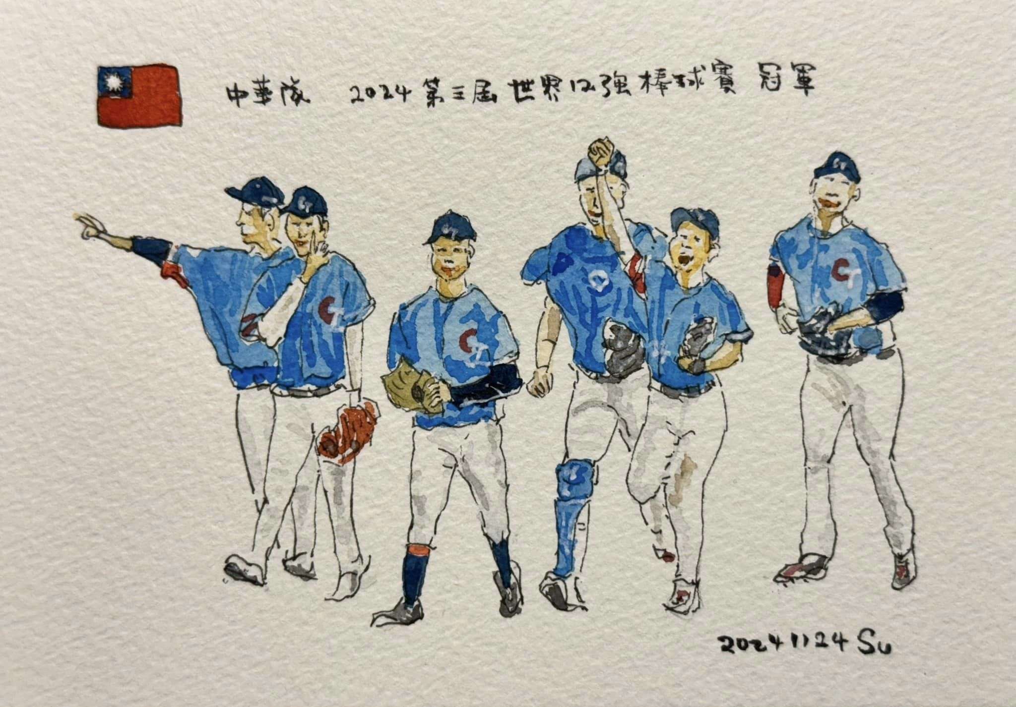 蘇俊賓接著提到,他一邊看著冠軍戰一邊畫下冠軍卡片,一方面覺得這樣特別有意義,也讓自己不那麼緊張,就在冠軍的那一刻,他幾乎用顫抖的手,寫下「中華隊 2024第三屆,世界12強棒球賽,冠軍」。