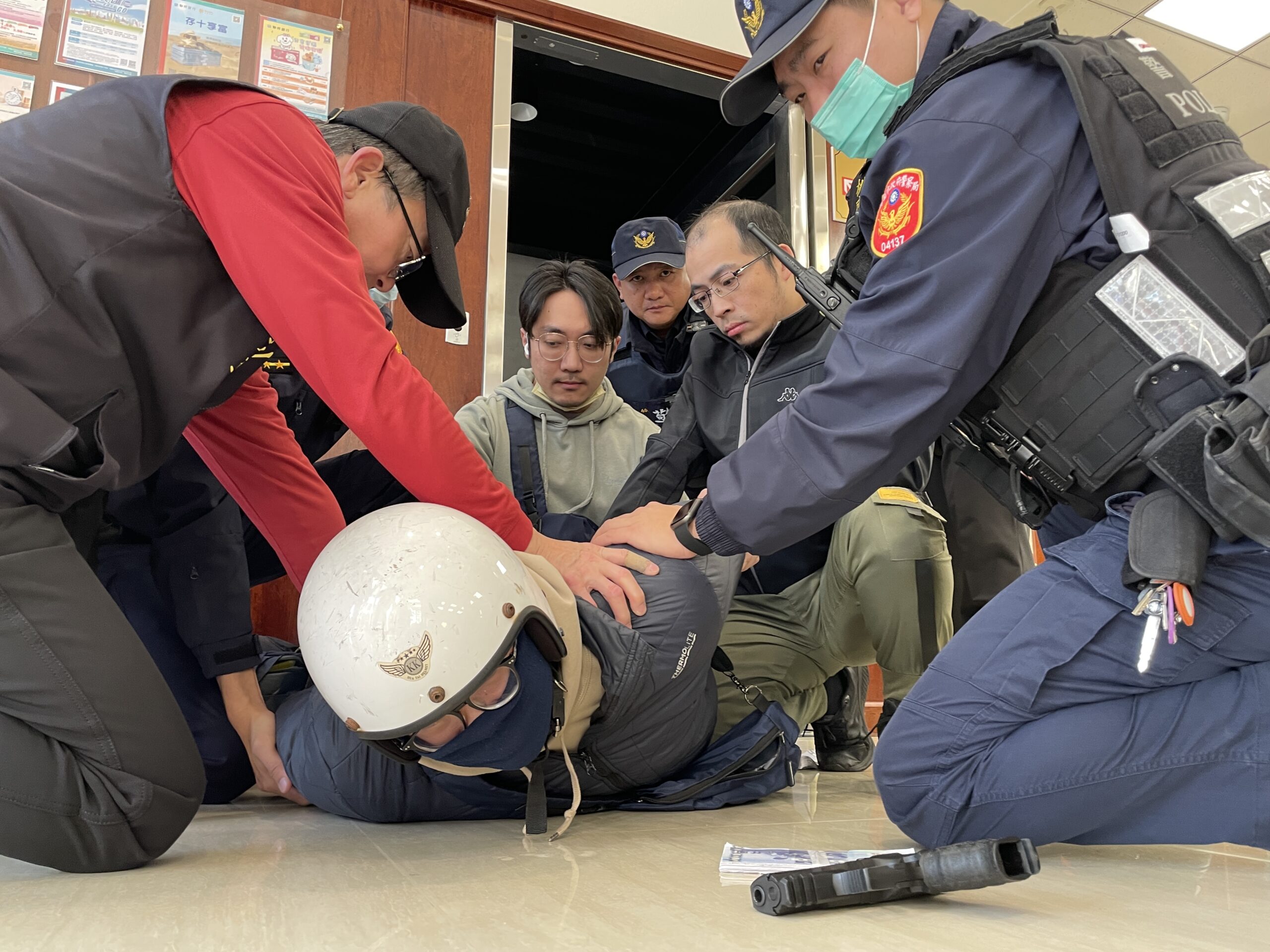 中壢警分局與聯邦銀行高榮分行合作,在今(7)日下午15時30分許舉辦防搶演練,飾演搶匪的警察同仁還因為太融入劇情,動作都十分逼真,不禁讓行員嚇一跳,也讓壓制他的兩位學長也是滿頭大汗,真實呈現警察制伏歹徒的激烈場面。