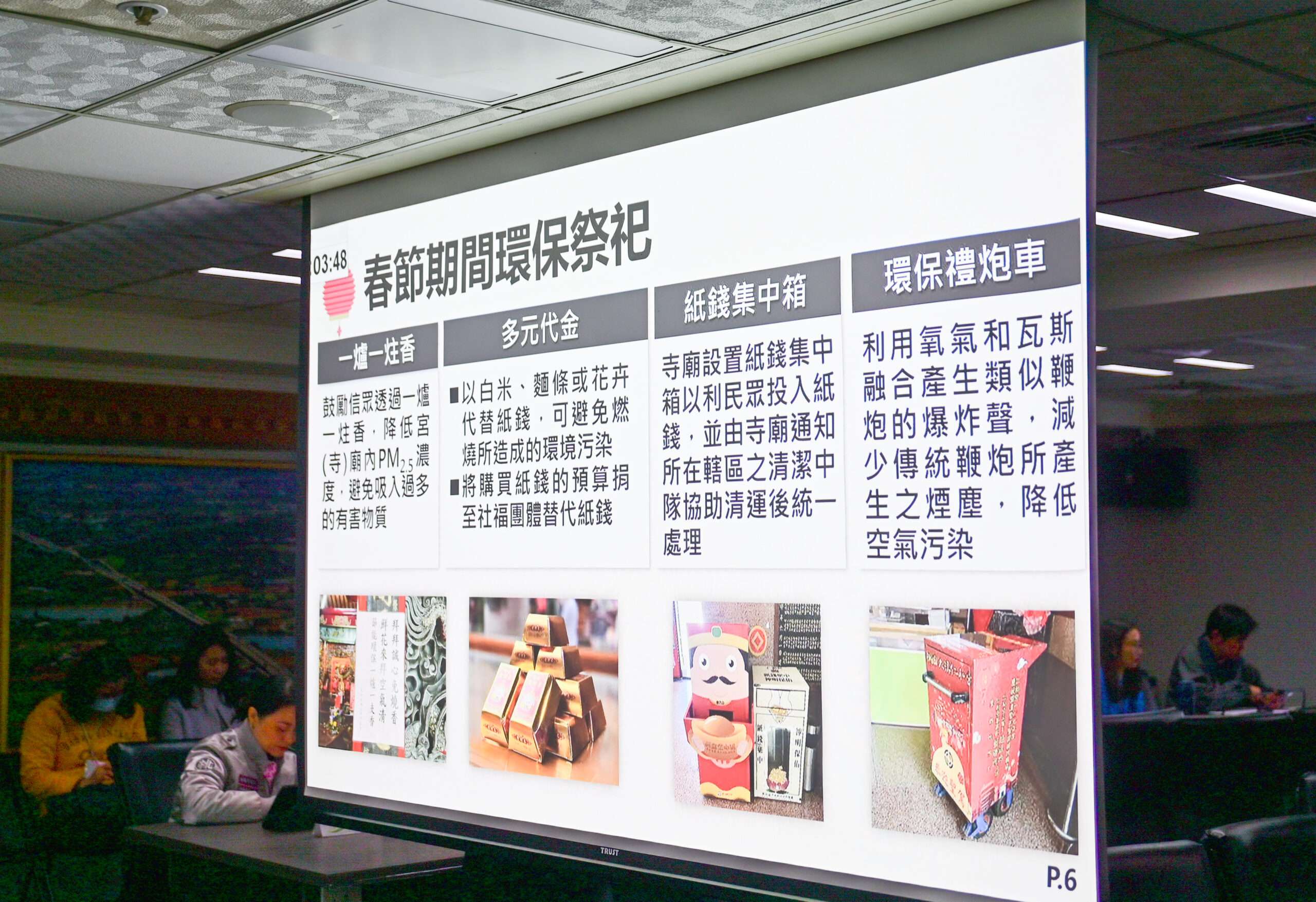 環保局長陳世偉指出,隨著農曆新年即將到臨,期望市民朋友在「食、衣、住、行、育、樂、購」七大生活領域改變習慣,實踐環保綠生活,以此減少二氧化碳排放量。另外陳世偉提到,春節期間放鞭炮屬傳統風俗民情,惟過去仍有民眾在午夜時段於高樓大廈街廓處施放鞭炮,為此環保局已與民政局、消防局及警察局等局處共同研擬方案,盼能夠限制此行為,以免造成市民朋友困擾,相關規定預計於1月24日進行討論及研擬。
