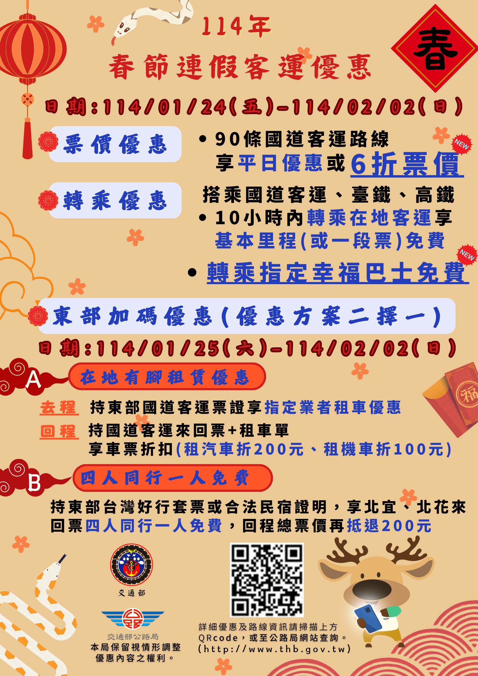 因應114年春節連續假期的來臨,交通部公路局為此制定了一系列大眾運輸疏運計畫,包含實施多項客運票價及轉乘優惠措施,以紓緩各景點之人車流。