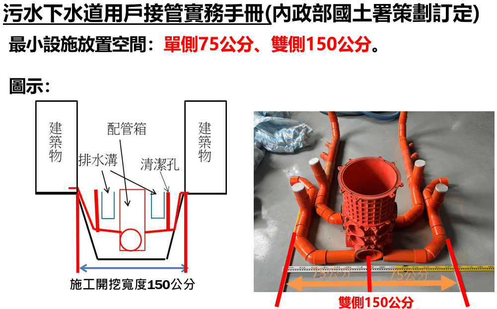 水務局指出,污水下水道建設是深埋在地底下看不到的隱形建設,為改善市民居家環境,中央編列預算補助辦理污水下水道用戶接管工程。桃園市政府依內政部國土管理署頒布「公共污水下水道管線設計手冊」的標準埋設用戶端匯流管、配管箱、連接管及新設雨水溝等設施,所需要埋設空間為單側75公分、雙側共需150公分,將民眾生活污水藉由密閉管路收集到最下游的水資源回收中心進行處理,用以取代傳統化糞池,改善市民居家環境與河川水質。