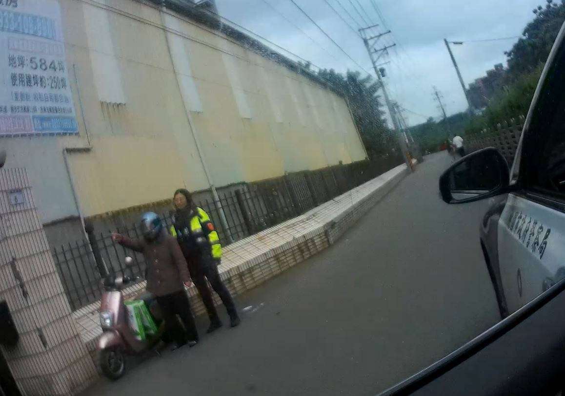 據了解,老婦清晨出門購買衛生紙,返家途中疑因體力不支,加上電動機車老舊,行駛時突然失去控制,導致跌倒受困。員警到場後分工合作,一人駕車護送老婦返家,另一人則協助將電動機車騎回其住處,確保人車平安。