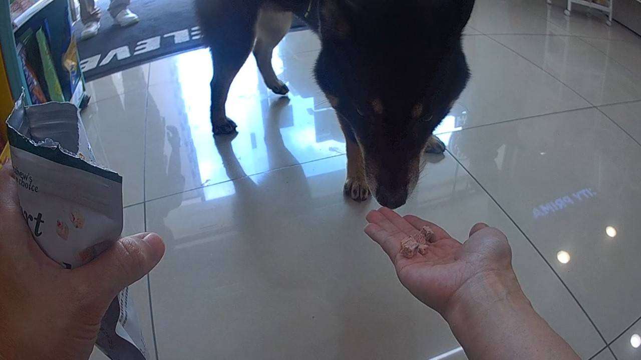 中路派出所進一步提到,陳員買來寵物零食餵養犬隻,但該犬隻在店內遊走讓民眾紛紛閃避,於是警方將其引導至店外,黑柴卻突然拔腿狂奔,員警在後尾隨,跑了幾個路口遇到正在找狗的飼主楊女。楊女說,她跟小朋友帶3歲的黑柴到公園散步,一旁工地發出的聲響把牠嚇到,黑柴掙脫牽繩「落跑」,在附近找了快1小時都沒見蹤影,現在看到牠帶著警察跑回來,非常感謝員警熱忱的協助,以後會更加注意,避免牠再次落跑。